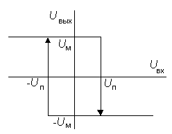 Из передаточной характеристики видно, что выходное напряжение находиться в состоянии положительного насыщения при входном сигнале Uвх, меньшем напряжения верхнего порога +UП. Если Uвх станет немного больше этого порогового значения +UП, напряжение на выходе схемы переброситься к –UM и останется в этом состоянии до тех пор, пока Uвх не станет меньше напряжения нижнего порога –UM.