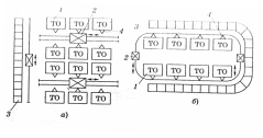Варианты планировочных решений размещения накопителя в виде складской цеховой системы зависят от компоновки размещения технологического оборудования. На рис. 17 показаны варианты планировочных решений. Т-образное планировочное решение характеризуется наличием транспортных систем доставки изделий из складской системы-накопителя 3 к технологическому оборудованию 1, а также загрузочных устройств 4. Вариант кольцевого решения требует кольцевого размещения не только склада 3, но и транспортной системы 2. Линейная планировка обеспечивается транспортной системой 3, при остановке по техническим причинам любого технологического оборудования 1, 2 накопительная складская система 4 с помощью транспортного робота загружает работающее оборудование полуфабрикатами. Цифрой 5 обозначена позиция линии, где контролируется выходящая с линии продукция.