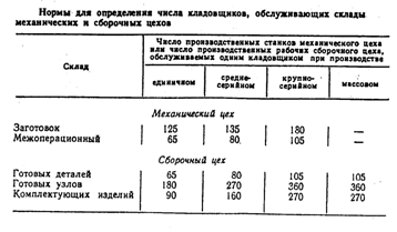 Число кладовщиков в складах механического цеха определяют при укрупненном расчете в зависимости от числа производственных станков в складах сборочного цеха - в зависимости от числа производственных рабочих по нормам, приведенным в таблице 4.
