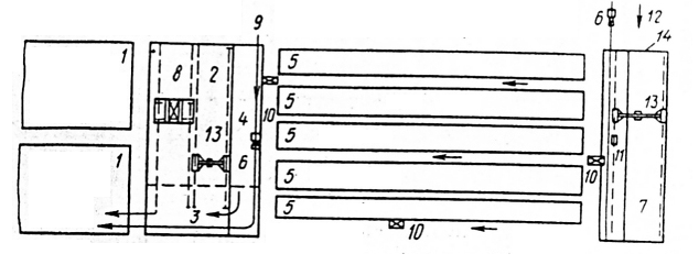 Пример схемы организации мелкосерийного и среднесерийного производства с применением автоматизированной транспортно-складской системы (АТСС) показан на рисунке 19. Стеллажный автоматизированный склад 7 обслуживается краном-штабелером 13. Заготовки в зону приема и комплектации доставляются электрогрузовозом с прицепной тележкой 6, входящей в состав подвесной транспортной системы 12 с автоматическим адресованием. Межоперационную передачу грузов на станочных линиях 5 осуществляют быстроходные рельсовые каретки-операторы 10 с автоматическим адресованием по командам диспетчера с пульта 11. Диспетчер имеет двустороннюю связь с каждым рабочим местом. Межоперационные заделы хранят либо на приемных столах у рабочих мест, либо возвращают на склад 7. Детали в таре передает каретка-оператор на участок контроля 4 и далее - подвесной электрогрузовоз - на площадку 3 приема комплектации и выдачи склада 2 готовых деталей. Склад готовых деталей оборудован автоматизированным краном-штабелером 13 и комплектовочным краном-штабелером 8. В сборочный цех 1 скомплектованные детали передаются подвесной транспортной системой с автоматическим адресованием 9.