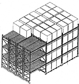 Глубинные стеллажи (рис. 19) – груз загружается по горизонтальным направляющим внутрь глубины стеллажа; ширина прохода между стеллажами составляет 1350 мм. Для того чтобы выгрузить внутренние паллеты, необходимо сначала выгрузить внешнюю паллету. Эффективность использования объема помещения в данных стеллажах на 25% выше, чем во фронтальных, и составляет до 50-60% от площадисклада. Глубинные стеллажи наилучшим образом подходят для изделий узкой номенклатуры или для хранения однотипных изделий.