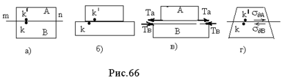 Пусть в деформируемом теле (рис.66, а) две части А и В разграничены условной поверхностью mn. Предположим, что эти две части в результате приложения внешней силы получают различные изменения размеров. Если бы элементы А и В могли изменять свою форму обособленно друг от друга, то в результате деформации они приняли бы вид, как на рис. 66, б. Однако, т.к. при деформации соблюдается условие сплошности тела, частицы «к» элемента А взаимодействуют с частицами «к» элемента В.