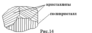 Логично было бы предположить, что внешние границы кристалла , повторяя правильность его внутреннего строения, должны иметь плоские грани. Однако этого не происходит. Кристаллизация из расплава идет одновременно из многих центров кристаллизации, и в процессе роста кристаллов они соприкасаются и мешают росту друг друга. Поэтому их внешняя форма не соответствует внутреннему строению. Такие кристаллы с правильной кристаллической решеткой, но неправильной внешней формой, называются монокристаллами, или кристаллитами (см. рис.14).