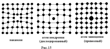 К точечным дефектам относятся вакансии, дислоцированные и примесные атомы. При точечных дефектах нарушение решетки локализуется в отдельных точках и не превышает нескольких межатомных расстояний во всех трех измерениях.