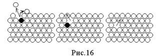 Основным источником вакансий является свободная поверхность кристалла. Атом поверхностного слоя, под воздействием флуктуации может легко выйти их узла решетки и испариться, или еще легче - адсорбироваться на поверхности (см. рис. 16). На его месте образуется пустой узел – вакансия. Через некоторое время в эту вакансию может быть выброшенным близлежащий атом, в результате чего вакансия переместится во второй слой и т.д. Другими словами, вакансия втягивается вглубь кристалла. Образование вакансии в результате выхода атома на поверхность называется дефектом Шоттки.