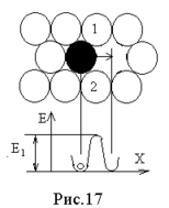 Рис. 17 иллюстрирует изменение энергии атома при выходе из узла плотноупакованной решетки. В узле он обладает минимумом энергии Е. Для того, чтобы выйти из узла, он должен «протиснуться» между атомами 1 и 2, т.е. как бы раздвинуть прутья решетки и преодолеть потенциальный энергетический барьер Е1. Эту избыточную энергию он получает от соседних атомов и отдает, снова занимая место уже в новом узле. Таким образом, флуктуация – источник образования и вакансий, и междоузельных дислоцированных атомов.