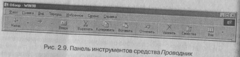 Панель инструментов средства Проводник. Панель инструментов средства Проводник представляет собой визуальный инструмент, используемый в большинстве приложений Windows. Она состоит из нескольких кнопок, с помощью которых обеспечивается быстрый доступ к командам различных меню приложения Проводник. Если поместить указатель мыши на кнопке панели инструментов, появится всплывающая подсказка, рассказывающая о функциях данной кнопки.