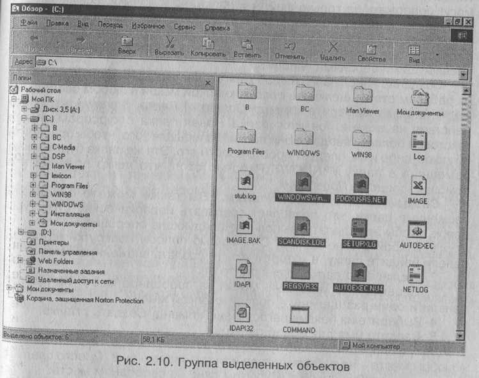Если включен режим Крупные значки, можно просто охватить нужные объекты так называемой рамкой выделения. Щелкните правой кнопкой мыши около первого объекта и, удерживая кнопку нажатой, охватите нужные объекты рамкой выделения. После завершения этой операции все выбранные объекты будут выделены, и вы можете выбрать из контекстно-зависимого меню нужные действия. На рис. 2.10 изображены объекты, выделенные этим способом. Обратите внимание на то, что все они находятся рядом друг с другом.