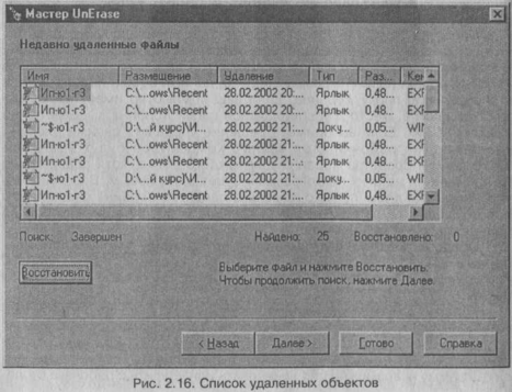 Для поиска файла, который был удален недавно, наиболее удобен вид окна в виде таблицы (рис. 2.16). В этом виде вы можете щелкнуть на кнопке Дата удаления, расположенной в верхней части таблицы, и все файлы будут выстроены в порядке дат их удаления. Повторный щелчок на этой кнопке возвратит исходный порядок. При щелчке на кнопке Имя файлы будут рассортированы по именам в алфавитном порядке.
