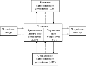 Фон Нейман не только выдвинул основополагающие принципы логического устройства ЭВМ, но и предложил ее структуру, которая воспроизводилась в течение первых двух поколений ЭВМ. Основными блоками по Нейману являются устройство управления (УУ) и арифметико-логическое устройство (АЛУ) (обычно объединяемые в центральный процессор), память, внешняя память, устройства ввода и вывода. Схема устройства такой ЭВМ представлена на рис. 1.3.