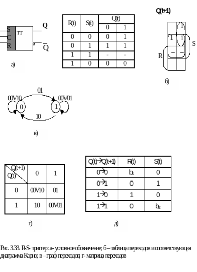 На рис. 3.33 представлено графическое изображение триггера и его описание во всех известных нам формах. При построении таблицы переходов кодирование строк осуществлялось аналогично кодированию строк диаграммы Карно, что позволило сразу, по таблице, получить аналитические выражения функции перехода
