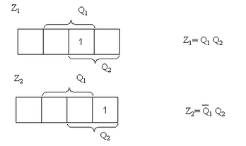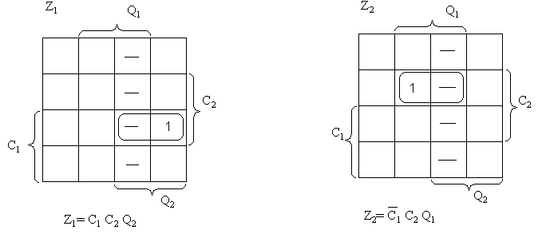 Нули и единицы диаграммы однозначно описывают характер перехода автомата. Так ноль левой части диаграммы Карно соответствует переходу 0→0, поскольку он лежит в полосе Qi(t)=0 и Qi(t+1)=0, а единица переходу 0→1, поскольку теперь Qi(t+1)=1. Аналогично для правой части диаграммы имеем для нуля переход 1→0, а для единицы – переход 1→1.