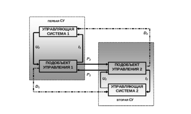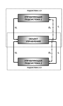 Кроме заведомой неоптимальности такого решения {Uopt1, Uopt2}, в общем случае требуется взаимный обмен информацией D1 и D2 об искусственно локализованных подобъектах управления и принимаемых в отношении них управленческих решений. Рациональность итогового сочетанного управленческого решения существенно зависит от последовательности его выработки, а также априорного, следовательно, и неэффективного распределения ограниченных управленческих ресурсов между управляющими подсистемами. Если информационные потоки D1 и D2 будут искажаться или окажутся неопределенными, даже применение мощного математического аппарата разрешения неопределенностей не позволит исправить положение.