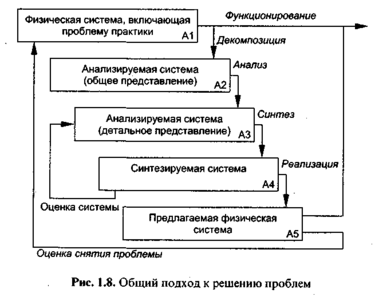 При этом в процессе функционирования реальной системы выявляется проблема практики как несоответствие существующего положения дел требуемому. Для решения проблемы проводится системное исследование (декомпозиция, анализ и синтез) системы, снимающее проблему. В ходе синтеза осуществляется оценка анализируемой и синтезируемой систем. Реализация синтезированной системы в виде предлагаемой физической системы позволяет провести оценку степени снятия проблемы практики и принять решение на функционирование модернизированной (новой) реальной системы.