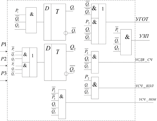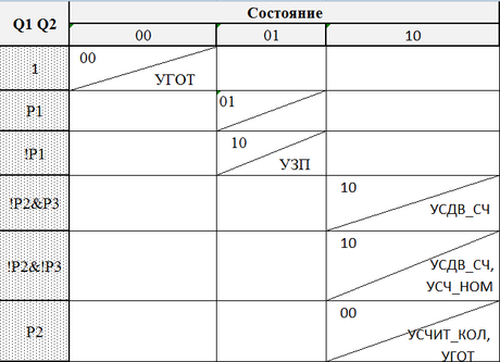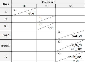 Можно сделать вывод, что управляющий автомат с жесткой логикой лучше строить как автомат Мили, т.к. он имеет только 3 состояния и реализуется на одном триггере. В качестве триггера будем использовать D-триггер.