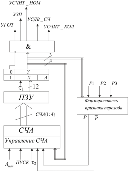 Начальный адрес микропрограммы, равный 000, устанавливается сигналом СБРОС, и УА ждет прихода сигнала СТРОБ для прохождения работы. Здесь τ1 – это тактирующая последовательность, а τ2 – счетчик адреса СЧА.