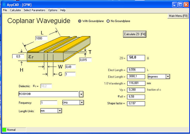 Расчет компланарной линии передачи производился программой AppCAD (ver2.0) фирмы Agilent Texnologies