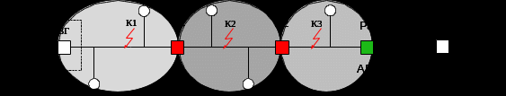 В схеме Рисунок.В.3 фидер разделен на три участка. Вместо разъединителей установлены автоматические реклоузеры. В данном случае, вероятность отключения потребителей определяется вероятностью возникновения повреждения на каждом конкретном участке. При возникновении КЗ на участке от головного выключателя ВГ до реклоузера R1 электроснабжение как и в первом случае теряют все потребители. При КЗ на участке от Р1 до Р2 отключатся только потребители за реклоузером R1, и в случае КЗ на участке за R2 питание сохранят все потребители за исключением третьего участка. Таким образом, при последовательном секционировании линии с односторонним питанием надежность потребителей отдельных участков уже не одинакова и тем выше, чем ближе секционированный участок, на котором находится потребитель, к центру питания. Показатели надежности в этом примере необходимо учитывать отдельно по каждому участку, а суммарный недоотпуск электрической энергии определяется как сумма недоотпусков при КЗ на разных участках линии.