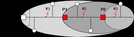 В случае последовательно-параллельного секционирования, из общей вероятности отключения потребителей условно вычитаются все повреждения на ответвлениях. Другими словами, вероятность отключения потребителя в пределах одного участка разделяется на вероятность отключения по причине КЗ на магистрали и вероятность отключения по причине КЗ собственно на ответвлении. При КЗ на магистрали отключатся все потребители в пределах одного участка, а при КЗ на ответвлении – только потребители данного ответвления.