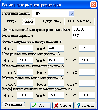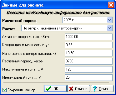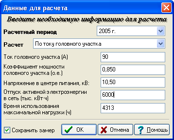 При выполнении расчета потерь электроэнергии за год по методу, основанному на времени использования максимальной нагрузки, необходимо ввести ток головного участка и данные либо по отпуску электроэнергии за год в линию, либо значение времени использования максимальной нагрузки (Тмакс).