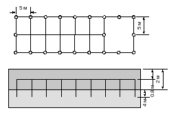В качестве заземлителей использованы: горизонтальная полоса из стали сечением (440) мм, проложенная на глубине 0.8 м; вертикальный электрод длиной 4 м (диаметр стальных стержней 1,2 м). Расчёт ведётся по ОРУ 10 кВ. Предварительная схема расположения группового заземлителя представлена на рисунке 5.1.