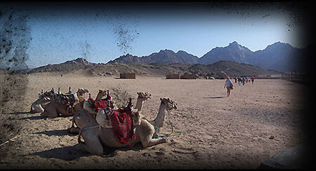 Взгляд начинает свой ход с правого верхнего угла, проходит по «ритму из верблюдов» (хорошее название для музыкальной группы) и, следуя направлению взглядов вышеупомянутых животных, попадает на цепочку уходящих людей и по ней уже приходит в горы.