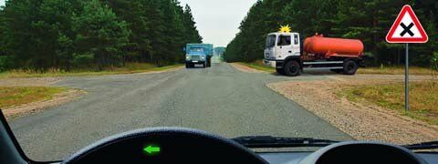«Пересечение равнозначных дорог», даже если пересекаемая дорога грунтовая, свидетельствует о том, что перед вами перекресток равнозначных дорог. Вы обязаны уступить дорогу обоим автомобилям: грузовому автомобилю с желтым (оранжевым) маячком, так как он находится от вас справа, и встречному грузовому автомобилю, поскольку он движется прямо п. 13.11 и п. 13.12.