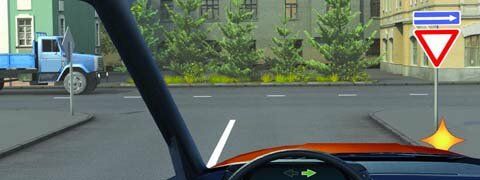 «Уступите дорогу» требует, чтобы вы уступили дорогу грузовому автомобилю, приближающемуся к перекрестку неравнозначных дорог по пересекаемой дороге. Поскольку понятие «Уступите дорогу» п. 1.2 не требует обязательной остановки, вы можете приступить к повороту направо, как только убедитесь в том, что грузовой автомобиль действительно поворачивает налево. При этом в процессе всего маневра вы не должны создавать помех для его движения п. 13.9.