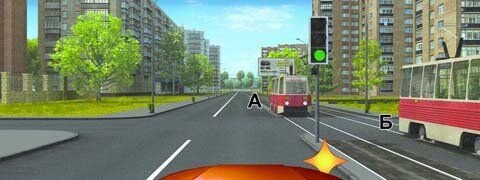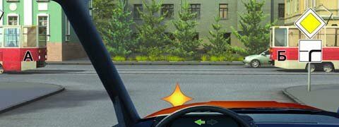 «Направление главной дороги») Вы должны уступить дорогу трамваю Б и легковому автомобилю, которые, так же как и Вы, находятся на главной дороге и являются для Вас «помехой справа». С ними Вы разъезжаетесь по правилам проезда перекрестков равнозначных дорог п. 13.10 и п. 13.11. Перед трамваем А Вы имеете преимущество, поскольку он движется по второстепенной дороге п. 13.9.
