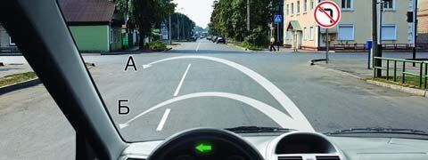 "Поворот налево запрещен" устанавливает запрет лишь на выполнение левого поворота, а вне перекрестка, двигаясь по траектории Б, Вы тоже не нарушаете Правил, ибо прерывистую линию разметки можно пересекать для выполнения маневров в любом месте.
