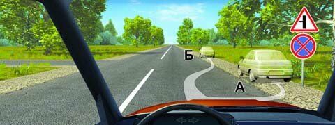 «Остановка запрещена» в данном случае распространяется до ближайшего перекрестка. Следовательно, вы можете поставить автомобиль на стоянку на обочине за перекрестком. Правильный ответ - Только Б п. 12.1.