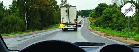 «Конец зоны запрещения обгона», вы, двигаясь за двумя грузовыми автомобилями, не имеете права начать обгон, так как на движущемся впереди грузовом автомобиле включены левые световые указатели поворота, и он приступил к обгону другого автомобиля п. 11.2.